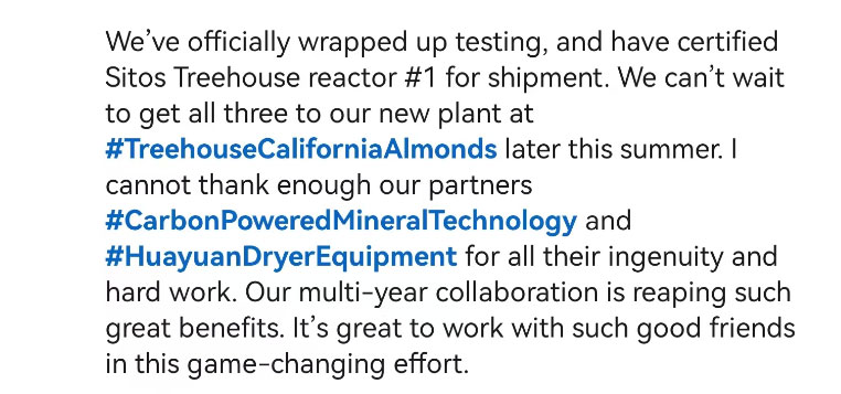 就在昨天,我公司为美国客户设计生产的炭基肥料生产线进行了五天的试运行测试,并测试了多种物料的生产状况,各项指标均符合或者超过了设计要求,客户非常满意并通过了验收。验收工作取得圆满成功。在验收的的同时,我们通过SGS公司检测了烟气的排放,各项指标均符合美国规定的排放要求。该生产线集成了原料的烘干、炭化、冷却、热能回收等工序,连续化操作,自动化程度非常高,并可以通过远程监控随时了解设备的运行。整条生产线只需2人即可操作,同时每年可减少不低于15000吨的碳排放。后续我们将继续与客户实时协作,在生产的同时优化该系统,以满足客户更高效、更安全以及更便利的日常生产要求。